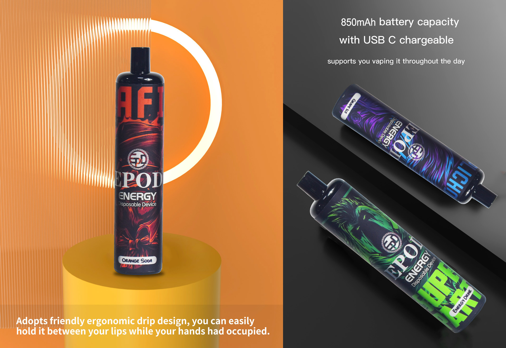 Η συσκευή EPOD αποτελείται από τα υψηλής ποιότητας υλικά μετάλλων, ελαφρύς και φορητός, και ανθεκτικός. Τροφοδοτείται από μια ενσωματωμένη μπαταρία 850mAh, και παρά το μικρό μέγεθός του, μπορεί να υποστηρίξει μέχρι 5000 ριπές. Όλες οι μίας χρήσης συσκευές λοβών EPOD δεν απαιτούν καμία συντήρηση, που χρεώνει, ή που ξαναγεμίζει μόλις χρησιμοποιηθεί, ρίξτε ακριβώς μακριά. Η μίας χρήσης συσκευή EPOD σχεδιάζεται με την κύρια ακρίβεια τεχνών και οι συσκευές προσφέρουν επίσης τη μεγάλη ικανότητα ε-χυμού με την υψηλής ποιότητας νικοτίνη που συνδυάζεται με τις απολαυστικές γεύσεις σε κάθε προϊόν μίας χρήσης. Όσον αφορά στους λοβούς, η ικανότητα είναι 12ml, το οποίο μπορεί να συναντήσει την καθημερινή χρήση σας. Επιλέξτε από μια ευρεία ποικιλία των εύγευστων γεύσεων ε-χυμού που περιλαμβάνουν τις συμπάθειες για πολλές.