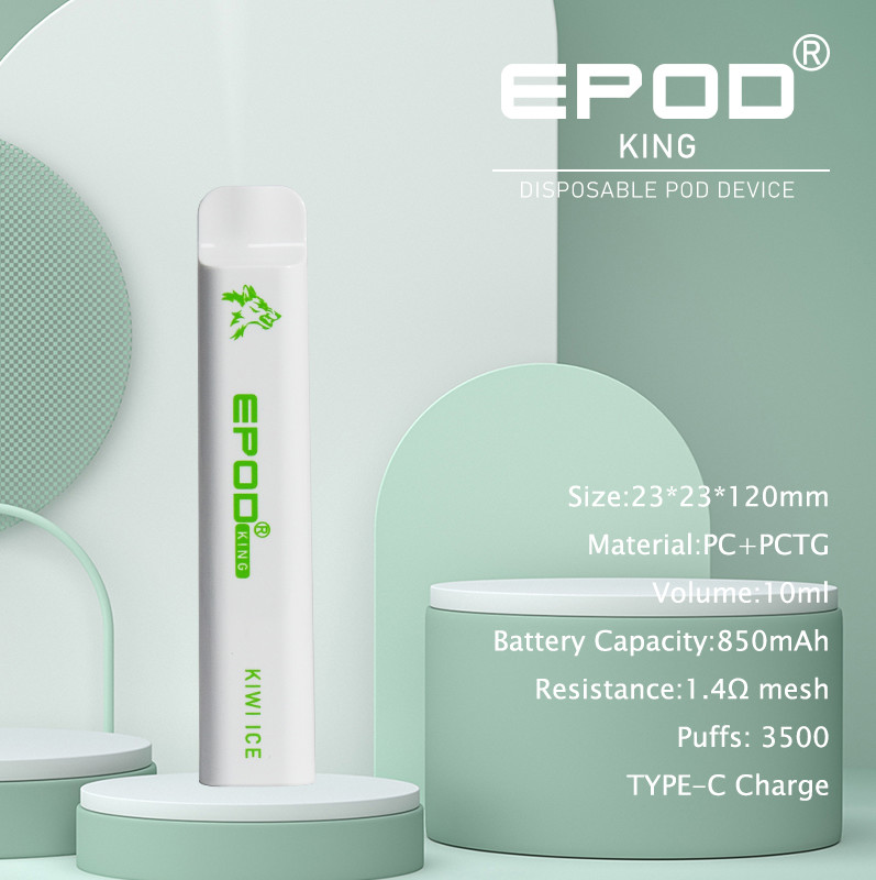 Ο βασιλιάς Epod είναι 3500 ξεφυσά τη μίας χρήσης συσκευή. Έχει μια μπαταρία 850mAh με τον επανακαταλογηστέο λιμένα και γεμίζεται εκ των προτέρων με 10ml του ε-υγρού που είναι νικοτίνη 5%. Ο βασιλιάς Epod χαρακτηρίζει επίσης μια σπείρα πλέγματος μέσα της συσκευής για τη πρωτοφανή παραγωγή γεύσης και χαρακτηρίζει επίσης μια λαστιχένια περίπτωση πυριτίου για το επιστόμιο στη συσκευή vape, το Epod θα παράσχει σε σας περίπου 3500 ριπές της καταπληκτικής γεύσης και έρχεται σε ποικίλες γεύσεις να ικανοποιήσει τους πόθους vape σας.