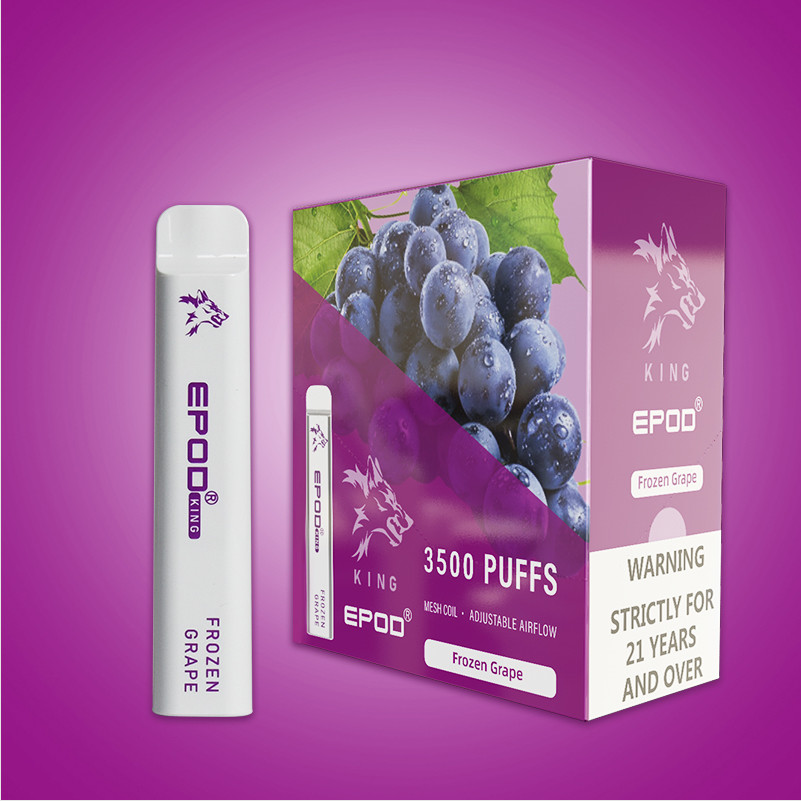 Ο βασιλιάς Epod είναι 3500 ξεφυσά τη μίας χρήσης συσκευή. Έχει μια μπαταρία 850mAh με τον επανακαταλογηστέο λιμένα και γεμίζεται εκ των προτέρων με 10ml του ε-υγρού που είναι νικοτίνη 5%. Ο βασιλιάς Epod χαρακτηρίζει επίσης μια σπείρα πλέγματος μέσα της συσκευής για τη πρωτοφανή παραγωγή γεύσης και χαρακτηρίζει επίσης μια λαστιχένια περίπτωση πυριτίου για το επιστόμιο στη συσκευή vape, το Epod θα παράσχει σε σας περίπου 3500 ριπές της καταπληκτικής γεύσης και έρχεται σε ποικίλες γεύσεις να ικανοποιήσει τους πόθους vape σας.
